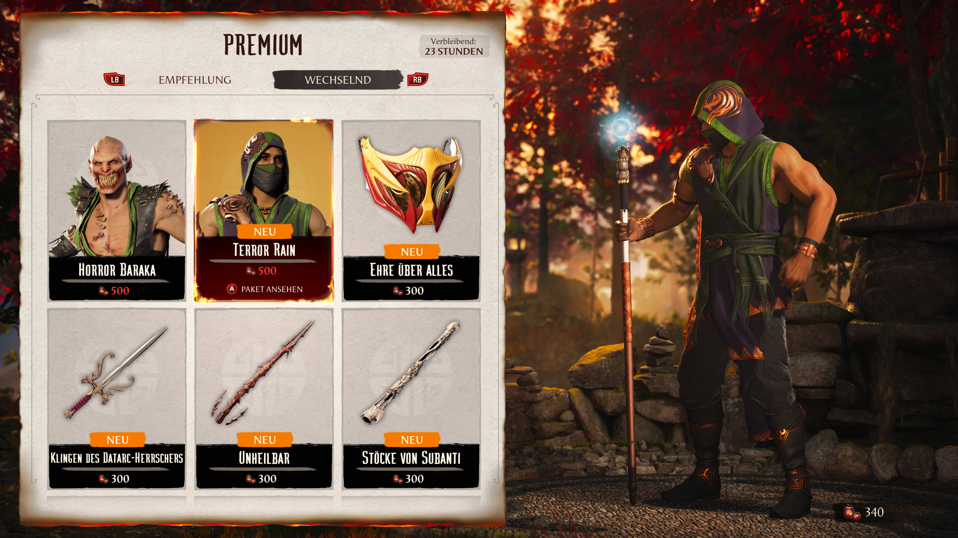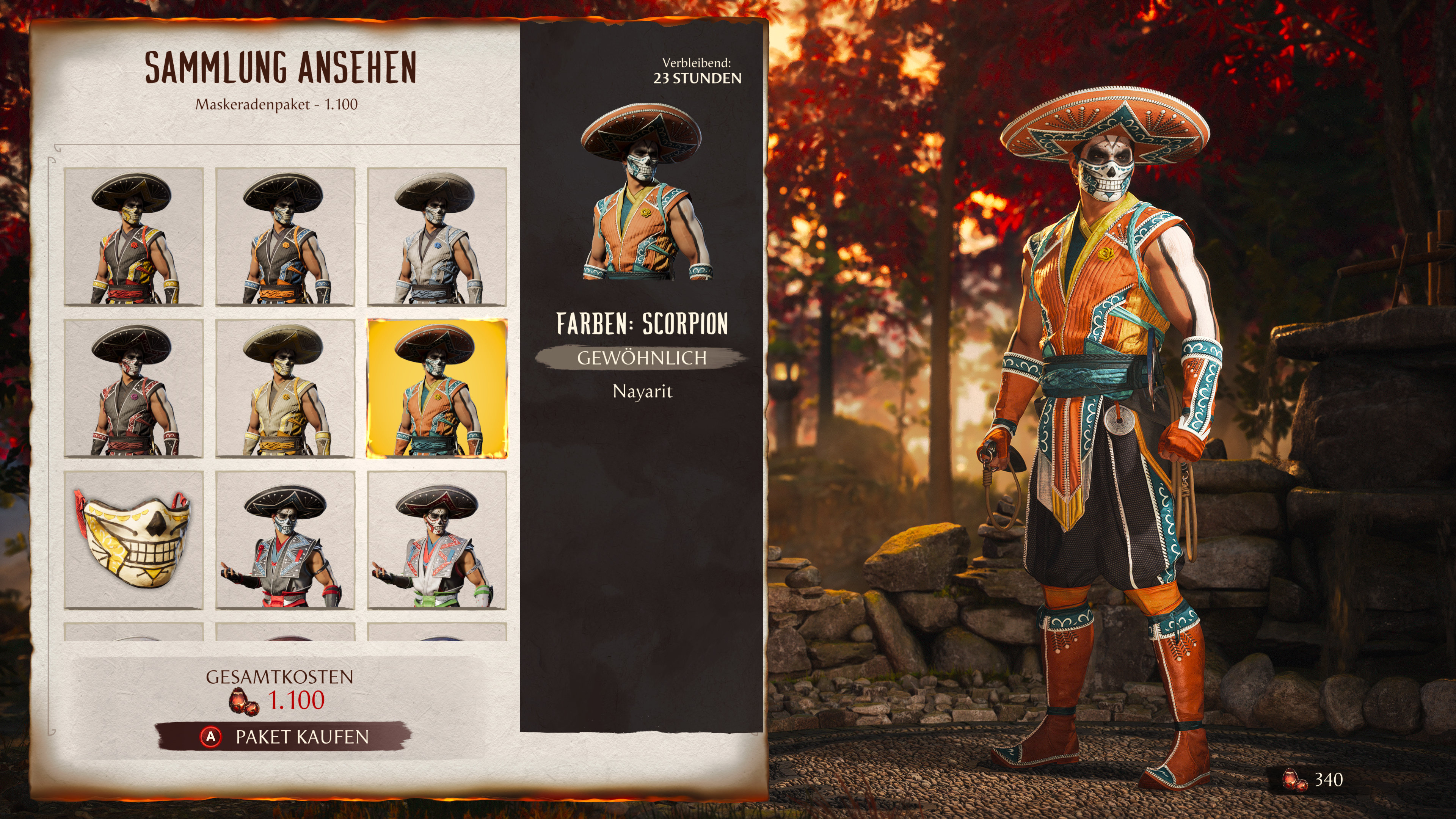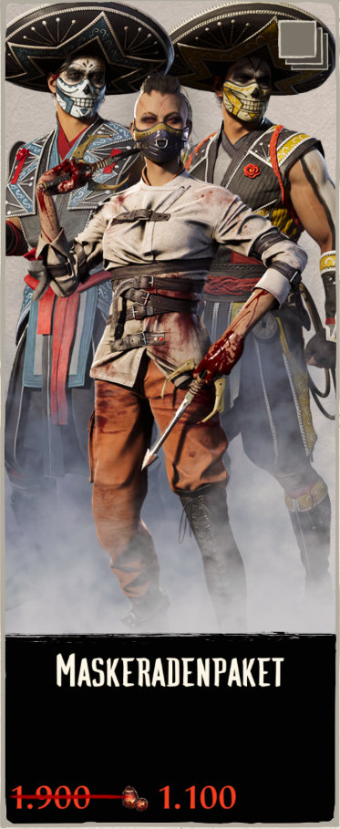 Maskeradepaket Kosten: Inhalt: Skin für Scorpion, Sub-Zero und Mileena; Maske für Sub-Zero und Scorpion; Sai für Mileena Sub-Zero: Jalisco - Gewöhnlich, Oaxaca - Gewöhnlich, Morelos - Gewöhnlich, Sinaloa - Gewöhnlich, Coahuila - Gewöhnlich, Queretaro - Gewöhnlich Scorpion: Zacatecas - Gewöhnlich, Tabasco - Gewöhnlich, Sonora - Gewöhnlich, Hidalgo - Gewöhnlich, Colima - Gewöhnlich, Nayarit - Gewöhnlich Mileena: Favabohnen und ausgezeichneter Chianti - Gewöhnlich, Psychotische Episode - Gewöhnlich, Unzurechnungsfähig - Gewöhnlich, Vorliebe für Fleisch - Gewöhnlich, Arglistige Absicht - Gewöhnlich, Rückfällig - Gewöhnlich Ausrüstung: Tampico, Xalapa, Albträume |