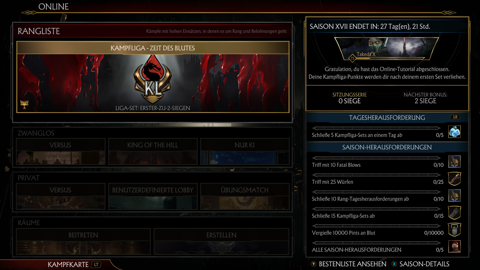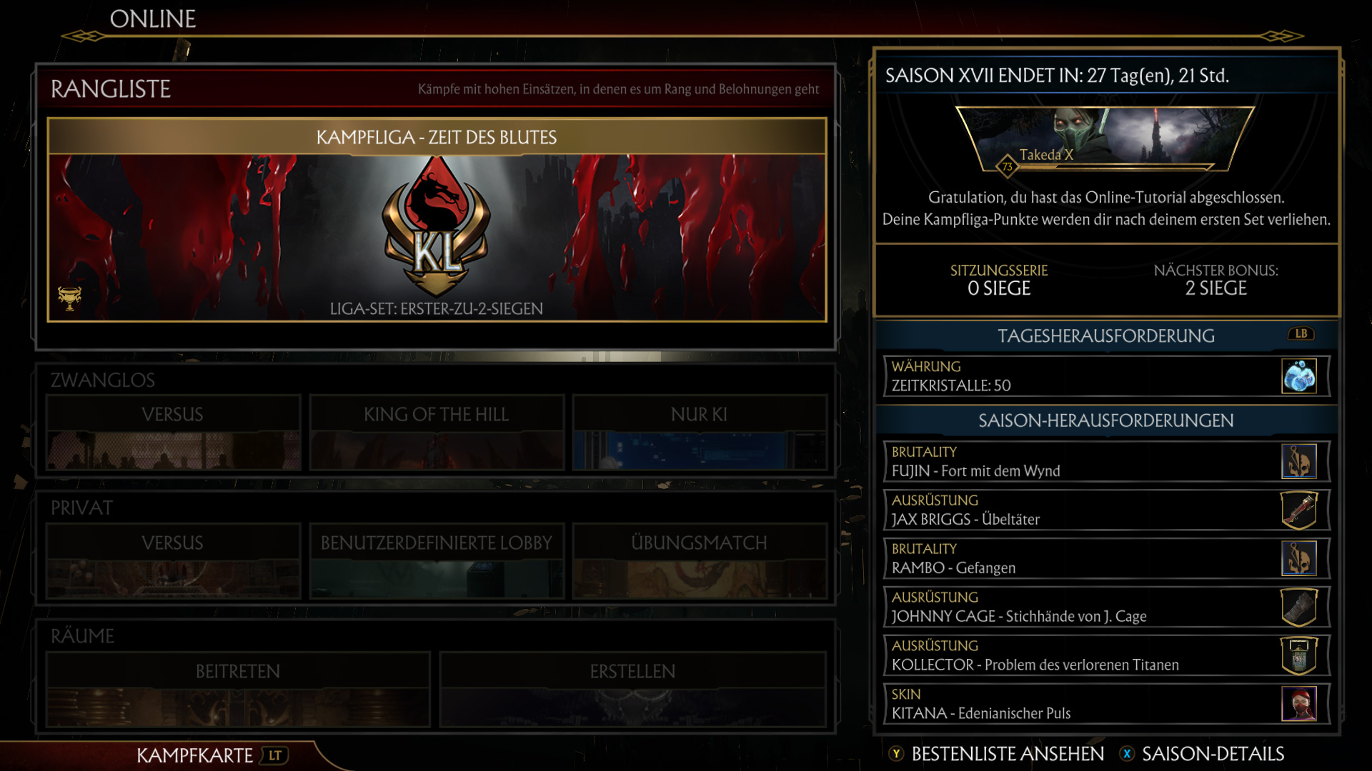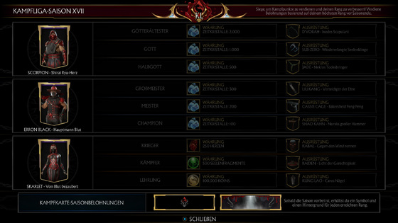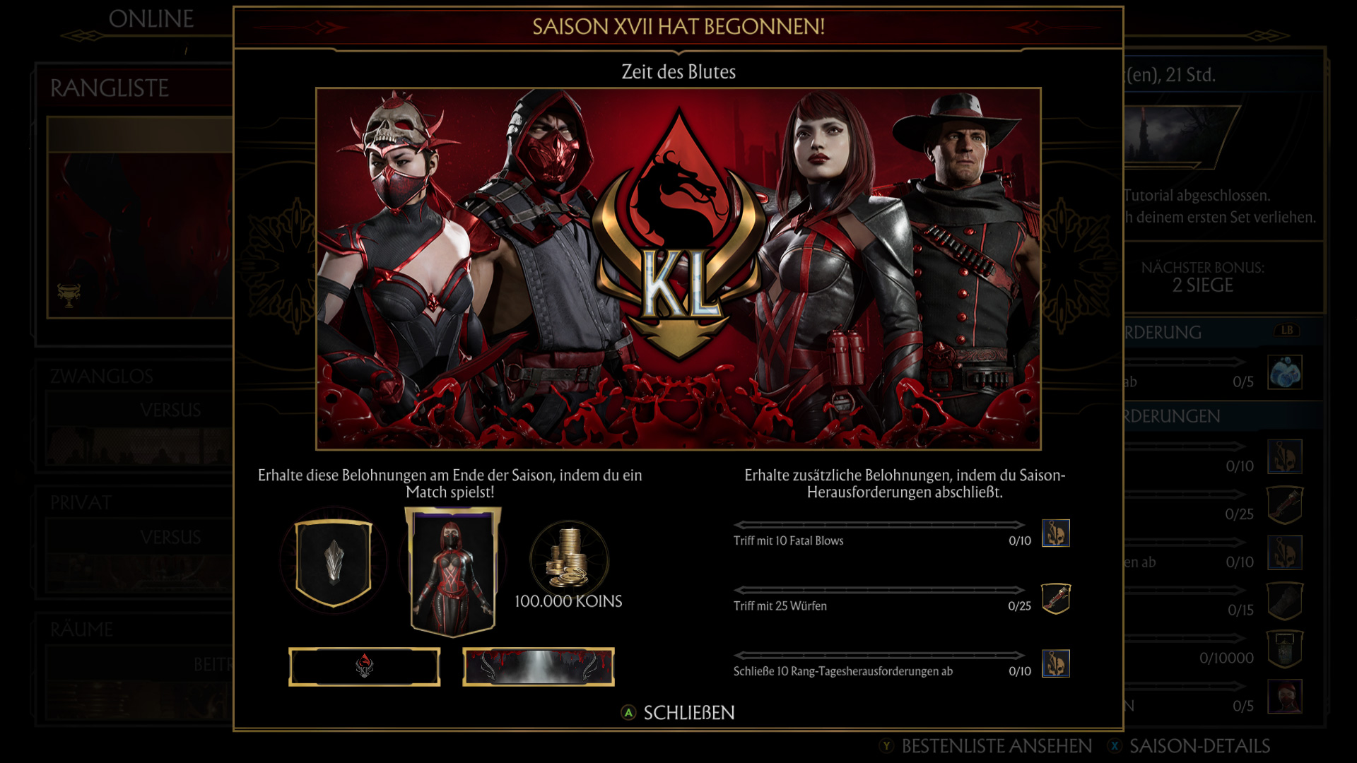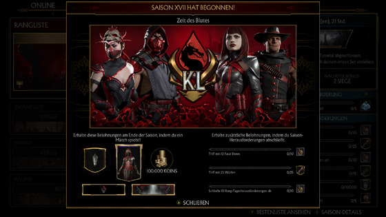 Die Season of Blood gab es bereits für die 1. Kombat League. Somit habt ihr die Chance verpasste Skins frei zuspielen. Die Position zum freischalten der Skins hat sich geändert und neue Ausrüstung und Brutality gibt es auch.