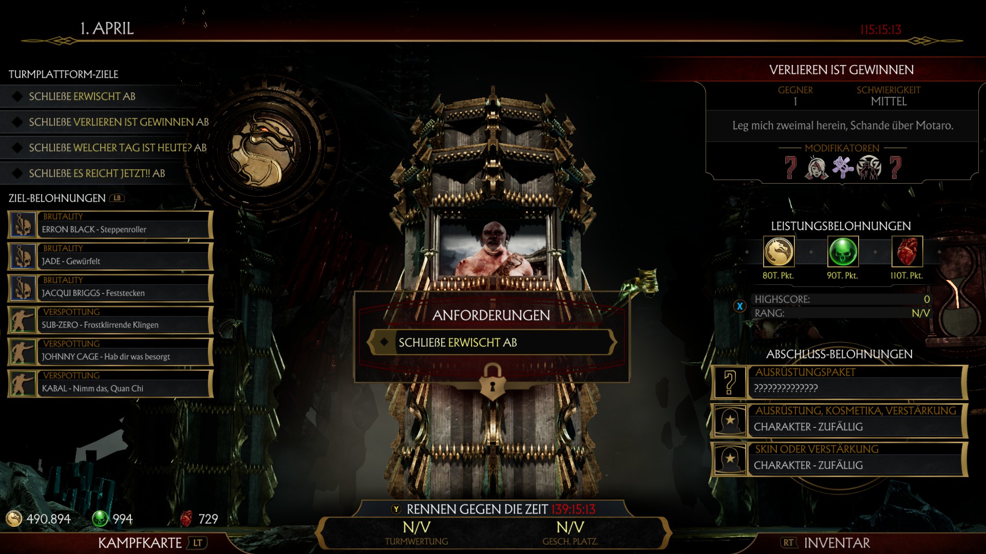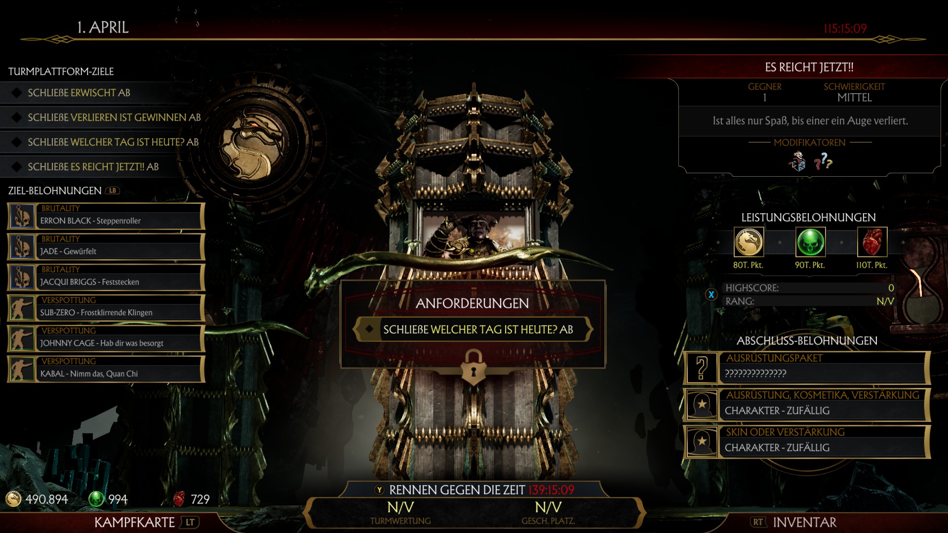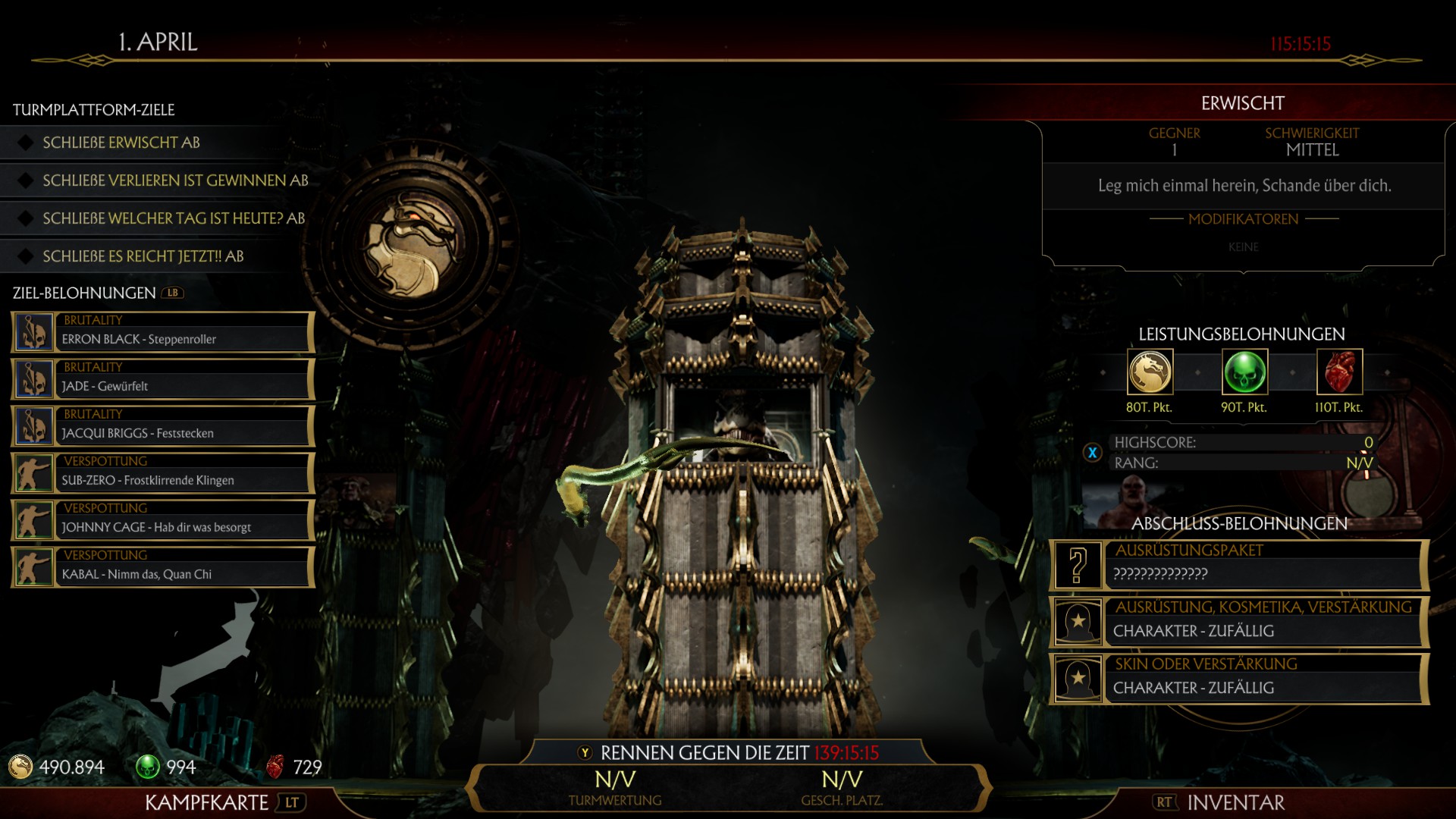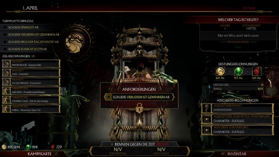 Im neuen Event sind auf der Insel 4 Türme wo ihr unter anderem gegen Jade und Johnny Cage behaupten müsst und diese sind diesmal recht knackig zu besiegen.