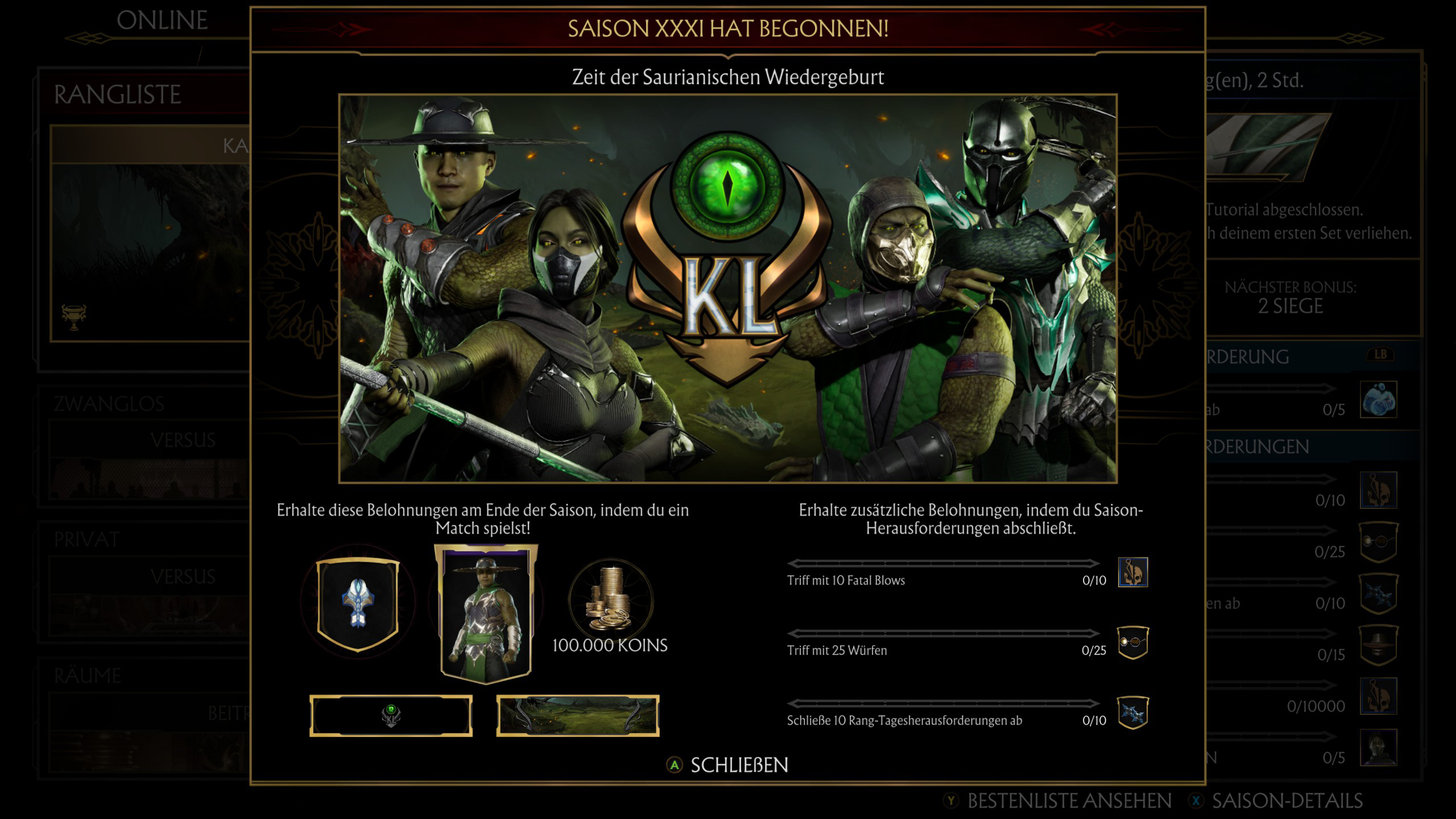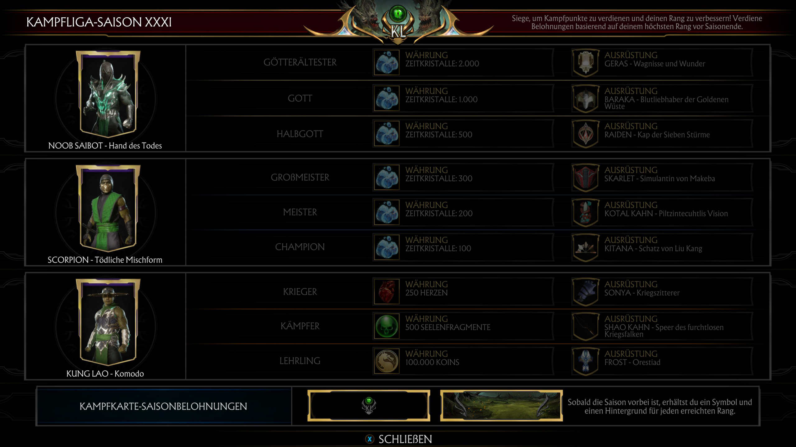 Auch dieses mal handelt es sich um eine Wiederholung der fünfzehnte Kombat League von 2020. Nicht desto trotz habt ihr nun wieder die Möglichkeit die Skins die ihr vielleicht verpasst habt zu erspielen.