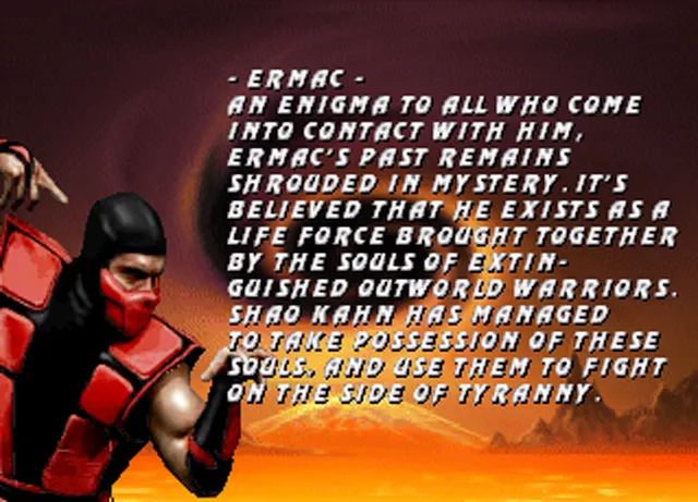 - Durch einen Fehler in Mortal Kombat 1 wurde Scorpion mit einer Fehlermeldung "Error Macro" rot dargestellt. In Ultimate Mortal Kombat 3 wurde dann tatsächlich ein roter Ninja eingebaut, welchen den Namen Ermac von "Error Macro" trug.