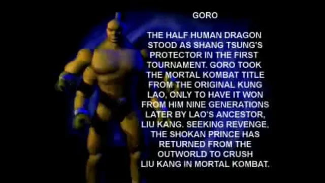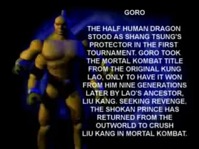 - Goro ist ein Sub-Boss in Mortal Kombat, Mortal Kombat 4 und Mortal Kombat 9.
