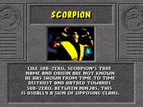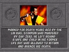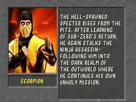 Scorpion war einst ein Mitglied des Shirai Ryu Clans bevor er vom Originalen Sub-Zero getötet wurde. Von Quan Chi wiederbelebt, tritt er beim Mortal Kombat Turnier ein, in dem er Sub-Zero tötete, um die Morde an seiner Familie und Clan zu rächen. Aber Sub-Zeros jüngster Bruder übernahm seinen Namen und die blaue Assassinen Uniform. Obwohl er Quan Chis Vollstrecker ist, wird Scorpion nicht ruhen, bis auch dieser Sub-Zero tot ist.