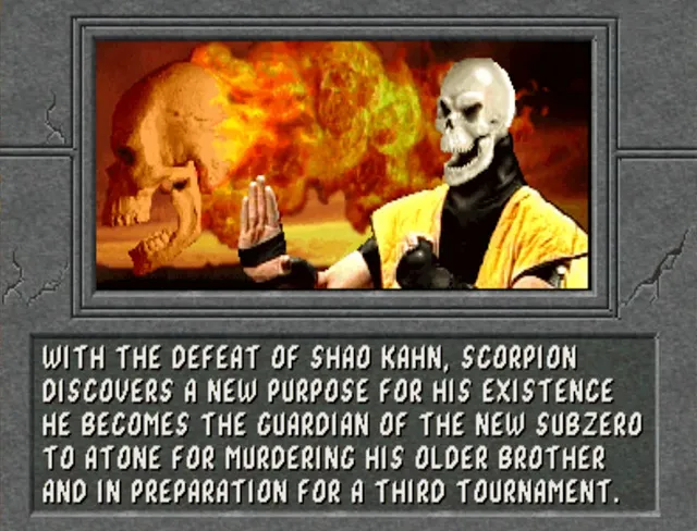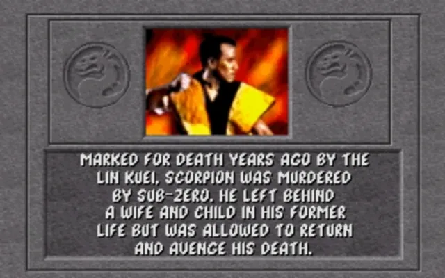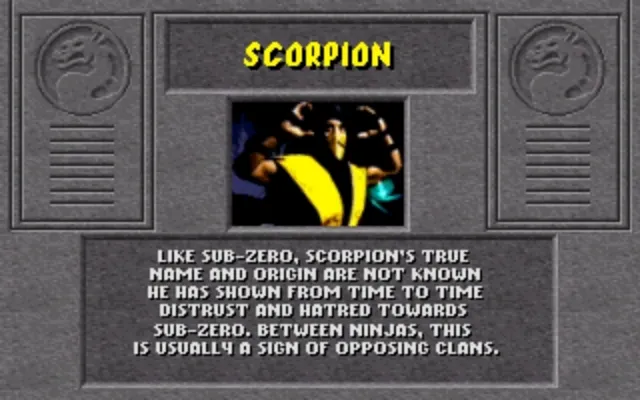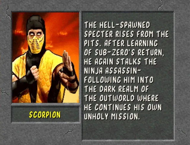 Wie sein geliebter Vater ist Scorpion den Lin Kuei und der Verteidigung des Erdenreichs verschworen. Als sein Vater starb, fand sich Scorpion ziellos wieder. Dennoch war er stolz, seinen Bruder Sub-Zero als den Nachfolger ihres Vaters als Großmeister der Lin Kuei zu sehen. Doch Sub-Zero´s beispielloser Versuch, die traditionellen Pflichten der Lin Kuei abzuwerfen, hat Scorpion´s Begeisterung gebremst. Er fürchtet, dass er eines Tages mit seinem Bruder um die Kontrolle über die Lin Kuei kämpfen muss.