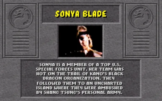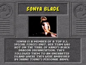 Als kleines Mädchen hat Sonya ihren Vater, einen US Marine, bewundert. Als er zu einer verdeckten Operation aufbrach und nie zurückkehrte, schwor sie, seine Erinnerung in Ehren zu halten. Sie trat den Marines bei und trieb sich selbst hart an. Sie machte schnell Karriere. Sonya`s impulsives Wesen hat ihr nicht viele Freund eingebracht, aber ihre Fähigkeiten und ihre Loyalität verschafften ihr Respekt und Bewunderung von all denen, die an ihrer Seite gekämpft haben. Obwohl sie nie aufgehört hat, nach der Wahrheit hinter dem Verschwinden ihres Vaters zu suchen, ist ihr bewusst, dass sie ihn wahrscheinlich nie wiedersehen wird. Nun steckt Sonya im mysteriösen Mortal Kombat Turnier fest. Wie ihr Vater könnte auch sie ein Opfer des Krieges werden.