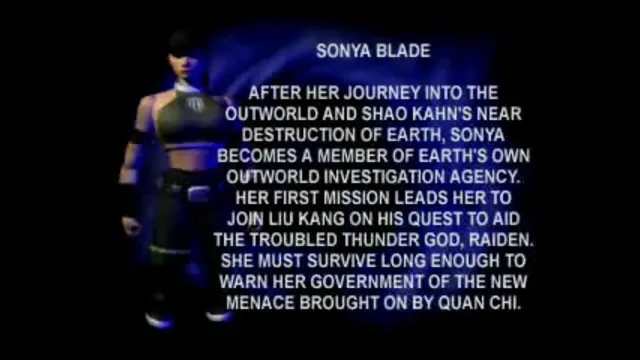 Sonya Blade, eine impulsive Spezialagentin, wusste nichts von anderen Reichen, bis sie bei der Verfolgung von Kano, ein Mitglied des Black Dragon, zufällig auf dem Mortal Kombat Turnier gestossen ist. Auf der Shang Tsung`s s Insel ist sie Liu Kang und Raiden begegnet und ihr Lebensziel hat sich für immer geändert. Sie hat ihren Partner, Jax, überredet eine Division der Spezialeinheiten zu leiten, die Earthrealm vor fremden Invasoren schützen sollte. Obwohl sie schon Kampferfahrung mit aussergewöhnlichen Drohungen von anderen Planten hatte, hätte sie nichts für die bevorstehende Invasion vorbereiten können.