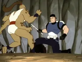 Animality: Stryker verwandelt sich in einen T-Rex und beisst dem Gegner den Oberkörper ab. (MK3,MKT)