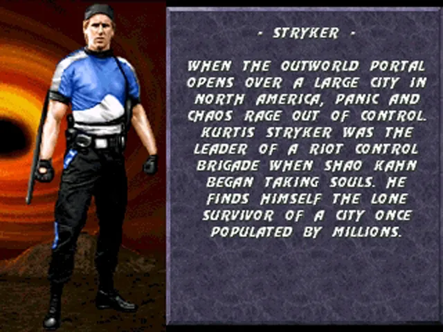 Stryker_Story000.jpgAls sich das Portal von Outworld über New York öffnet, gerät alles in Panik und Chaos. Kurtis Stryker war Anführer einer kleinen Polizeieinheit als Shao Kahn begann die Seelen zu stehlen. Kurtis Stryker findet sich als einziger Überlebender einer Millionenstadt wieder.