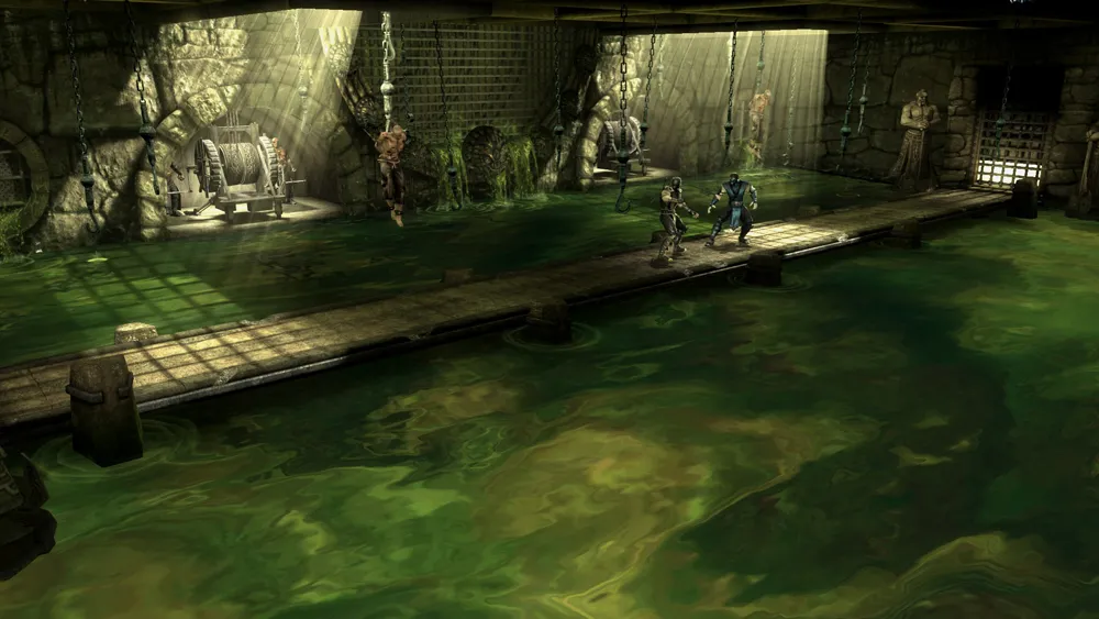 Die Arena The Dead Pool befindet sich in der Einöde von Outworld. Um den schmalen Steg befindet sich Säure, alles was hin einfällt, löst sich auf. Hier werden diejenigen bestraft, die sich gegen den Imperator Shao Kahn erheben.
