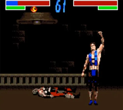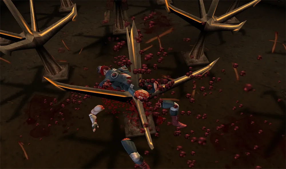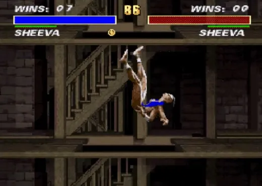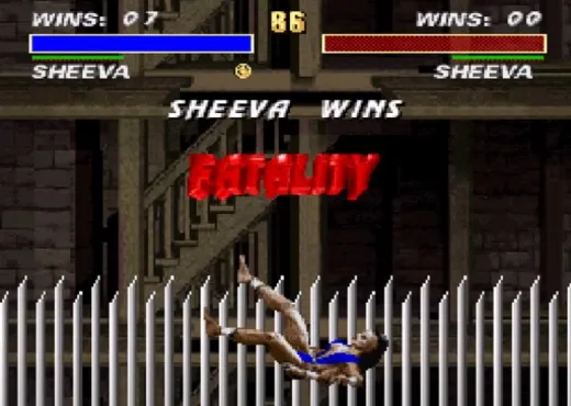 Nach Finish Her/Him bricht der Gegner die Etage hinunter und stirbt an den folgenden der am Boden befindeten Stacheln.
