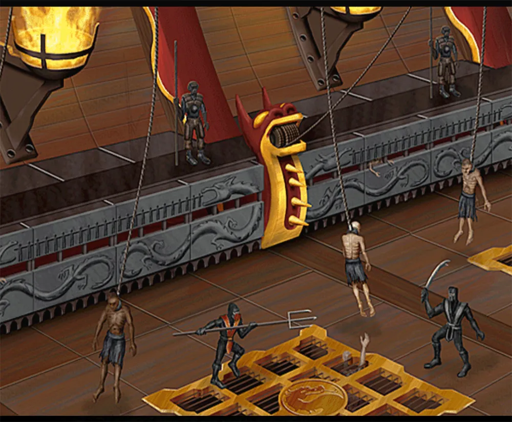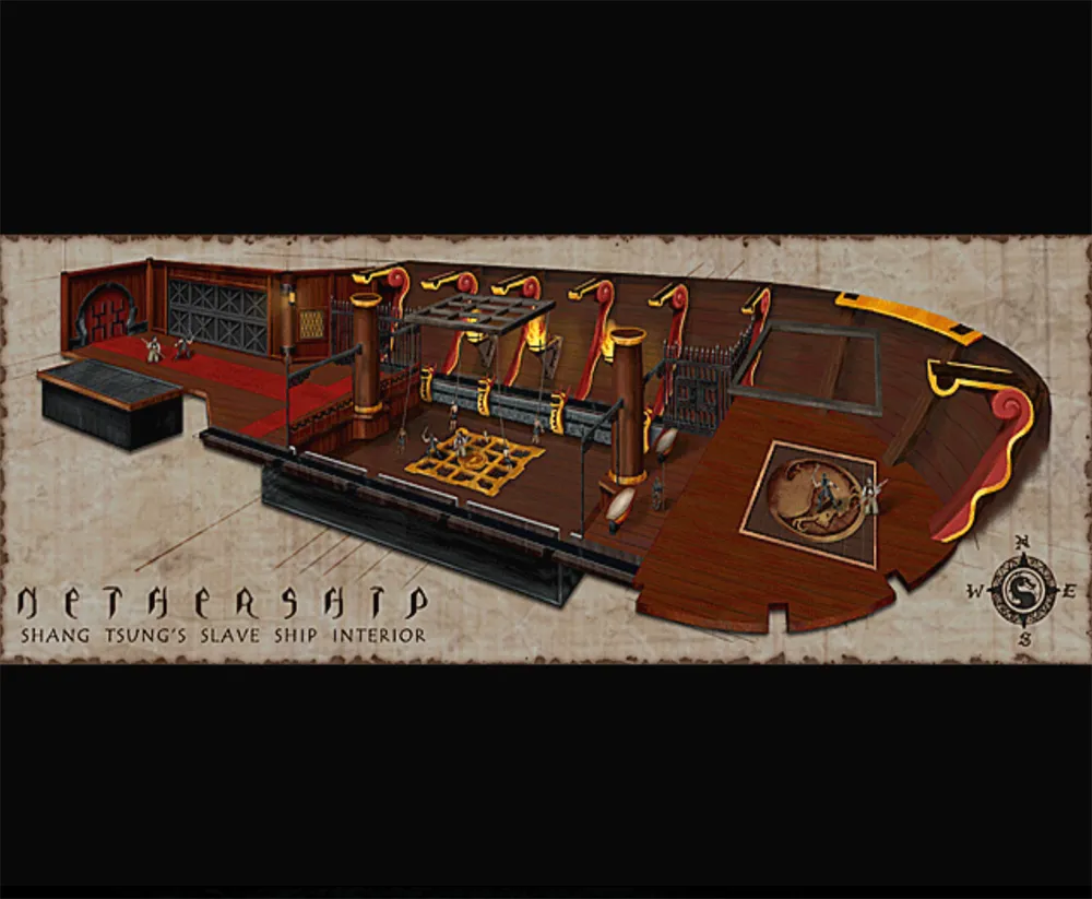 Das ist der Laderaum von Shang Tsung´s Nethership wo ihr im inneren des Schiffes kämpft. Früher, zu Zeiten des Mortal Kombat Turniers wurden die Kämpfer zu Shang Tsungs Insel gebracht.