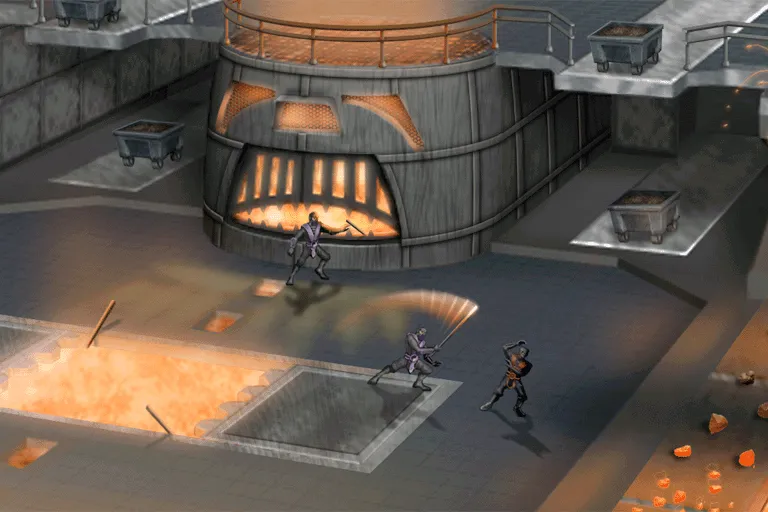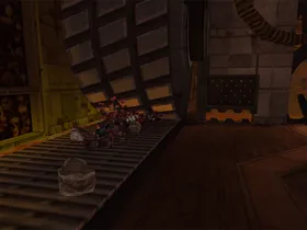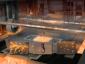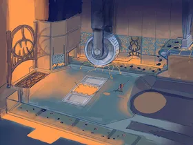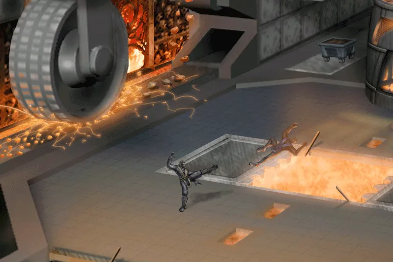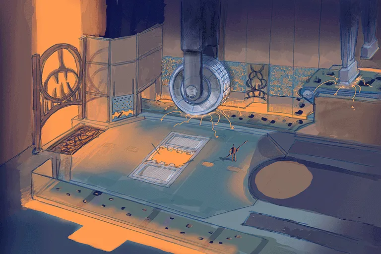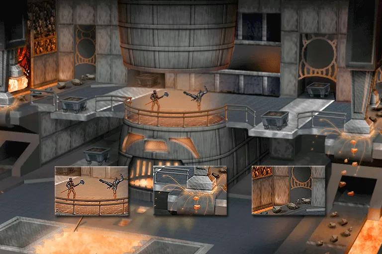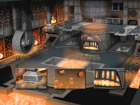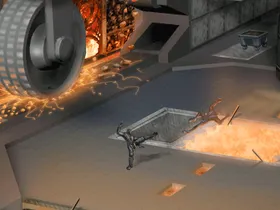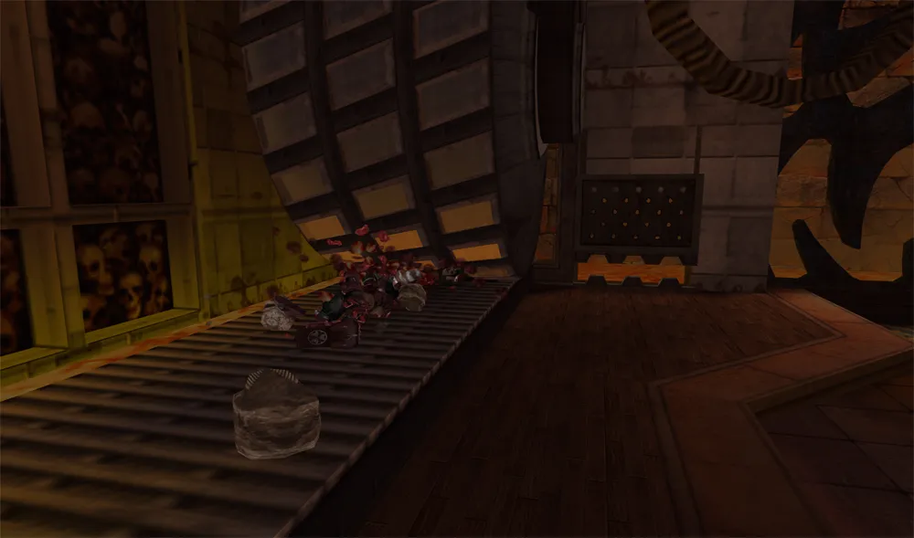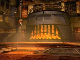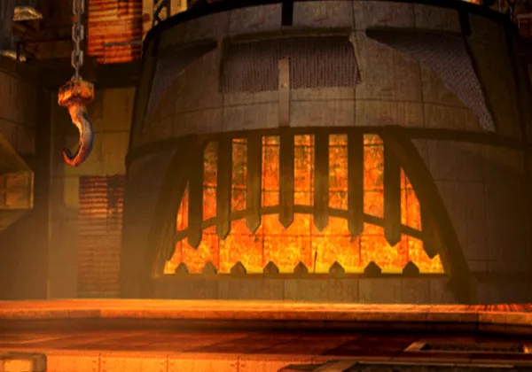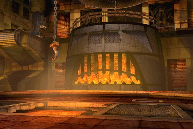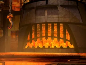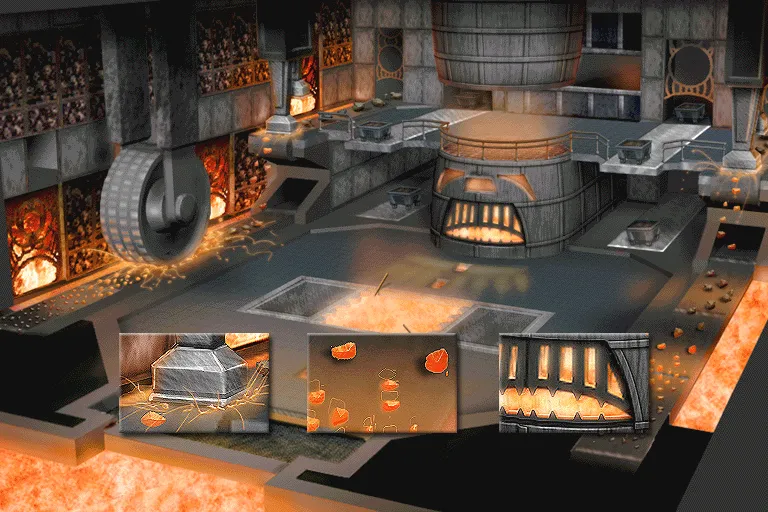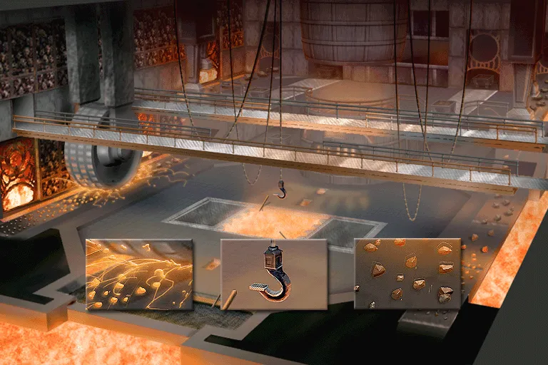 Auf zwei Ebenen wird Eisenerz von Förderbändern transportiert. Maschinelle Zerstampfer und ein Zerkleinerungsrad zerbrechen das Erz. In den Wänden sind Schädel eingefügt.