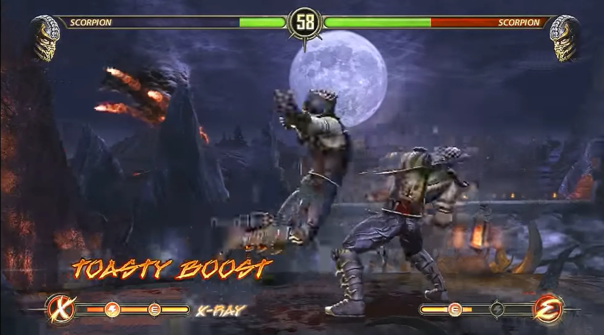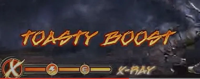 Der Toasty Boost ist ein neues Feature in Mortal Kombat 2011. Wenn Dan Forden nach einem Upercut erscheint und man eine bestimmte Tastenabfolge, s.u. drückt erhält man dieses Special, dass einem die Meteranzeige komplett bis zu einem X-Ray auffüllt.