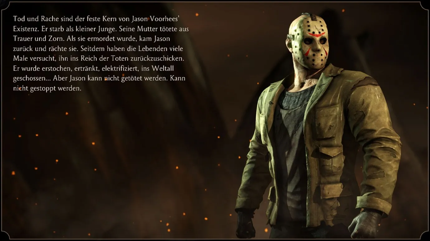 Wie Scorpion war Jason Voorhees ein Wiedergänger: ein rachsüchtiger Geist, der wieder zu Leben erwacht war. Hunderte waren seiner Mordlust zum Opfer gefallen. Liu Kang, inzwischen Herrscher des Unterreichs, wurde auf ihn aufmerksam. Ein unsterblicher Mörder wie Jason könnte ihm bei seinem Streben nach Macht von Nutzen sein. Er rief Jason ins Unterreich und bot ihm als Belohnung endlose Opfer … als Gegenleistung für seine Treue. Jasons einfache Antwort war, Liu Kang zu vernichten.