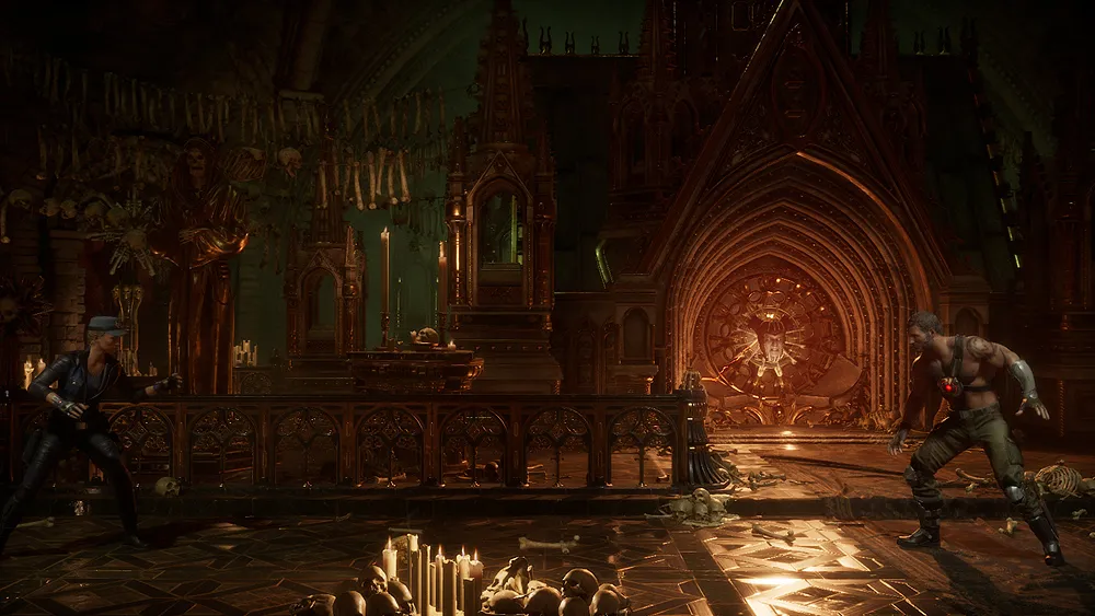 Der Kopf von Shinnok beobachtet den Kampf im Tempel. Die Arena befindet sich im Netherrealm, im Schloss von Shinnok. Auf der rechten Seite der Arena kann ein Amulett eingesetzt werden, um dem Gegner Schaden zu zufügen. Links befindet sich die lex_armor Knochensense.